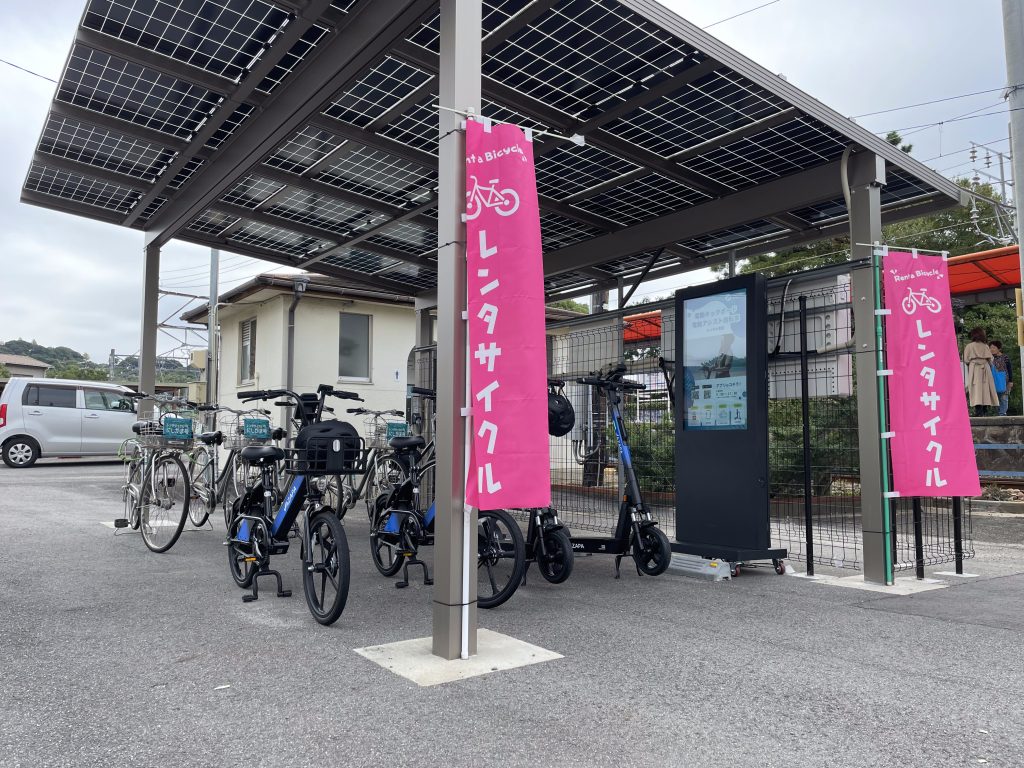 鉄道駅からの二次交通の確保・充実を目的に電動キックボード、電動アシスト自転車、デジタルサイネージを配置します。